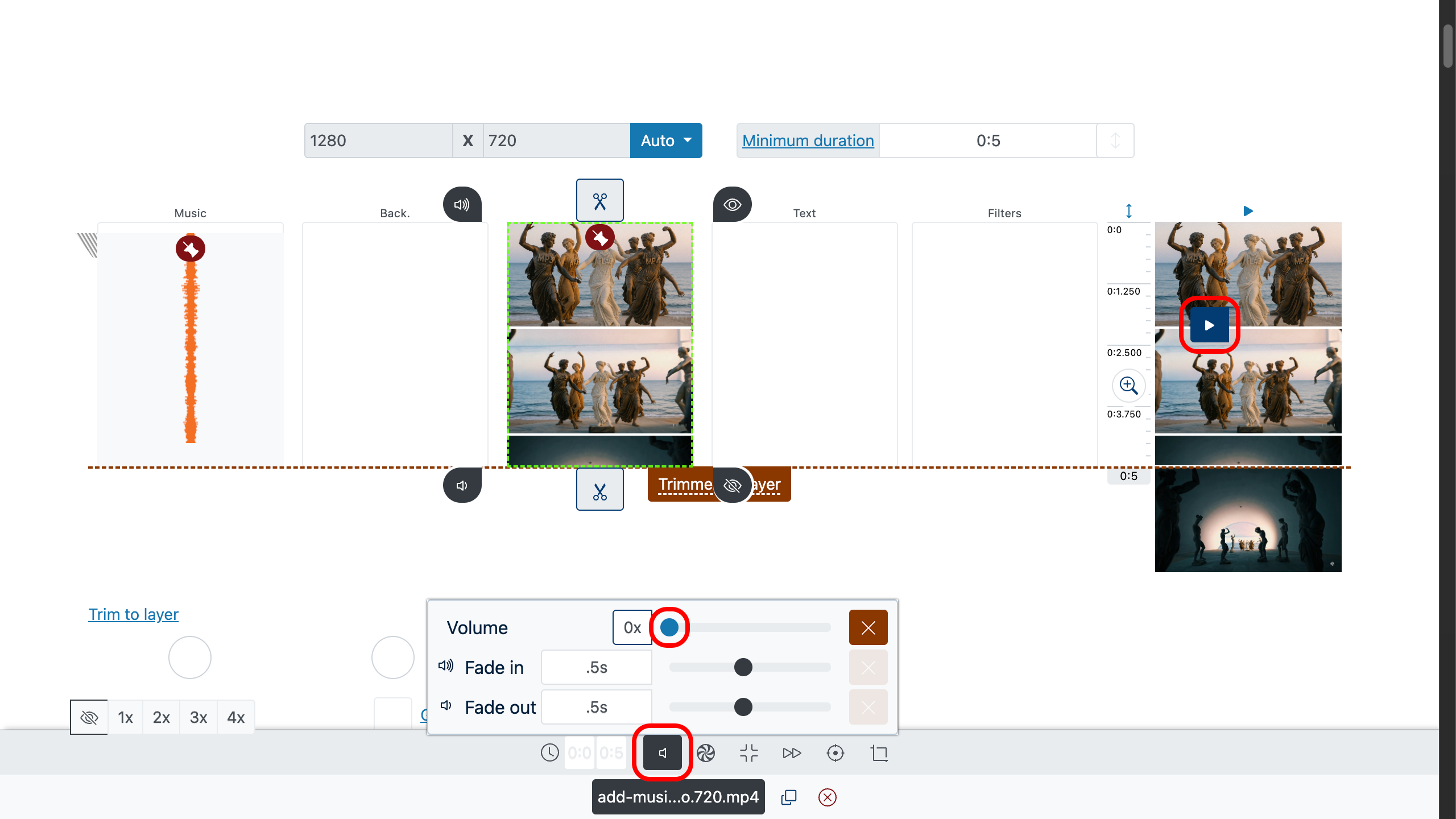 Usa el volumen para bajar la música de fondo y destacar el audio principal (diálogo, sonidos clave en escena). Baja la música para que acompañe la escena sin competir con ella.